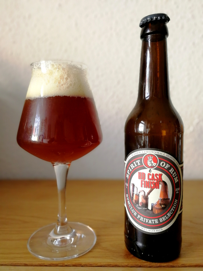 Dann also weiter zum eigentlich Grund dieses Artikels, dem Spirit of Rum Rumclub Private Selection HD Cask Finish. Es ist, wie gesagt, nicht die erste Zusammenarbeit zwischen den beiden Firmen, das Etikett erzählt von der „5. Rumclub Beer Selection“. Man deklariert sich auch als „Single Cask Craft Beer“, die Bedeutung ist mir nicht hundertprozentig klar. Als Grundbier dient nicht das oben besprochene Dunkle Lager, sondern das Lemke Original Wiener Lager, das mit 6,0% Alkoholgehalt für 5 Wochen in einem Rumfass gelagert wird, das vorher ein Destillat der jamaikanischen Hampden-Destillerie („HD 2000“) beherbergte.