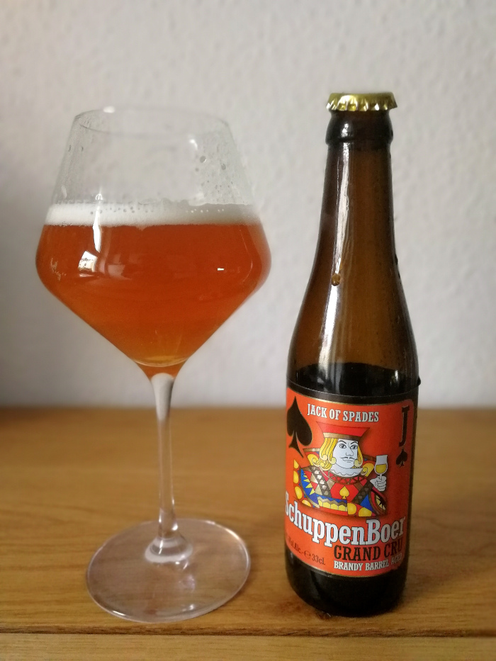 Die große Kiste mit belgischem Bier, die mir mein Freund Dimitri nach dem legendären Whisky-und-Zigarren-Abend bei ihm zuhause geschenkt hat, ist für mich eine wahre Fundgrube an Entdeckungen. Ich verstehe inzwischen sehr gut, warum die belgische Bierkultur als UNESCO-Weltkulturerbe anerkannt ist, da ist wirklich viel Kreativität und Energie drin. Als gute Beispiel dafür mögen diese zwei Biere dienen, die ich der Bierkiste nun entnommen habe: Brouwerij Het Nest Schuppenboer Maxima Calvados Barrel Aged und Grand Cru Brandy Barrel Aged, fassgereifte Exemplare aus Oud-Turnhout in Nordbelgien zwischen Antwerpen und dem holländischen Eindhoven. Die von Spielkarten inspirierten Etiketten und Kronkorken sind ein Markenzeichen, das hohen Wiedererkennungswert bietet – ich hoffe, die Brauer pokern hier nicht zu hoch und haben statt einem Paar Dreien eher einen Flush auf der Hand!