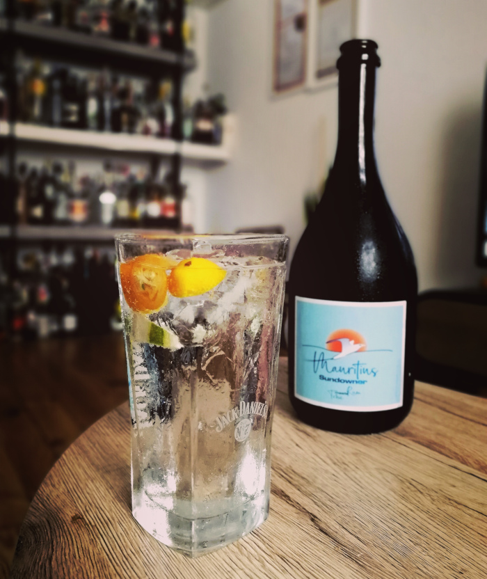 Ein Rum Tonic ist für mich ein besserer Drink als ein Gin Tonic. Punkt. Das habe ich schon vor mehreren Jahren entdeckt, und in einer Zeit, in der es immer beliebter wird, dass Premixes auch für den Endandwender auf dem Markt sind, freue ich mich sehr, dass mein persönlicher Geschmack nun auch in diesem neuen Sektor zufrieden gestellt wird. Mit dem Mauritius Sundowner findet sich ein fertiger Longdrink in der großen Sektflasche, bestehend zu einem guten Anteil aus Oaks & Âmes Gold Rum aus der Oxenham Distillery, verortet natürlich auf der namensgebenden Insel im indischen Ozean. Mit 10% Alkoholgehalt ist er nicht zu stark auch für allerlei Anstoßgelegenheiten im Büro oder zuhause und damit nicht nur was für Hardcore-Rumfreunde. Plopp, weg ist der Korken, und entspannt gieße ich mir ein Glas ein!