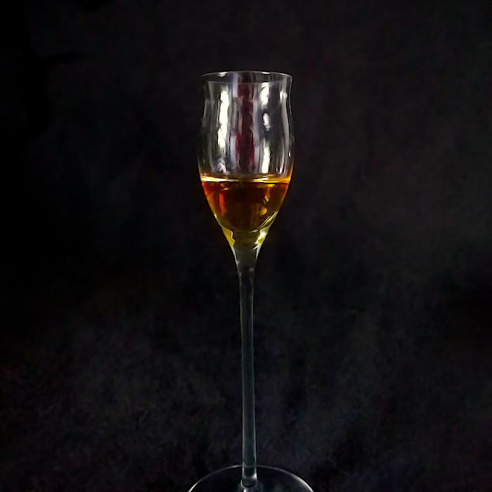 Das Jahr, das die Zuckerrübenspirituose in Fässern aus amerikanischer Eiche (auf der Shopseite findet man den Hinweis, dass es sich um eine Mischung aus amerikanischer und französischer Eiche handelt) ruht, lässt eine elegante, gelbgoldene Farbe entstehen – es wird nicht gefärbt. Man sieht darüber hinaus schöne Viskosität beim Schwenken und langsam ablaufende Beinchen.