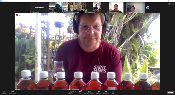 So eine Sammlung bietet sich natürlich perfekt an, sie gemeinsam mit Freunden zu verkosten. Für Leute wie mich, die keine Freunde haben, hat Luca Gargano ein Online-Tasting angeboten – am 22.10.2022 fanden sich rund 150 Teilnehmer bei Zoom zusammen, und konnten unter der Leitung von Gargano zusammen mit dem Production Manager bei Saint James, Marc Sassier, die einzelnen Proben zu Gemüte führen. Spannende Details erfuhr man da, ein unterhaltsamer Abend war es darüber hinaus natürlich – und vielleicht lässt Gargano sogar dieses Tasting als größtes Rumtasting der Geschichte ins Guinness Buch der Rekorde eintragen.