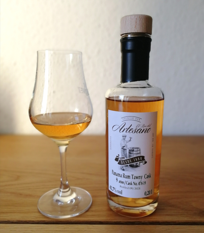 Ein Jahr länger Pause gönnte man dem El Ron del Artesano Panama Rum Tawny Cask 9 Años, abgefüllt mit 41,7%. Auch hier kam dafür ein Ex-Portweinfass zum Einsatz, aber man entschied sich für Tawny statt für Ruby. Ich erwarte hier nur wenig Unterschied, was die Fruchtausprägung durch die Fasswahl angeht – farblich ist schon klar erkennbar, dass der Tawny-Port trotz des zusätzlichen Jahres weniger eingeschlagen hat: Ein leicht blasser Bernsteinton, mit einem Ticken von rötlichen Reflexen. Man muss das Verkostungsglas ordentlich schwenken, um die Flüssigkeit in Bewegung zu bringen, danach haben wir ein hübsches Glaswandverhalten.
