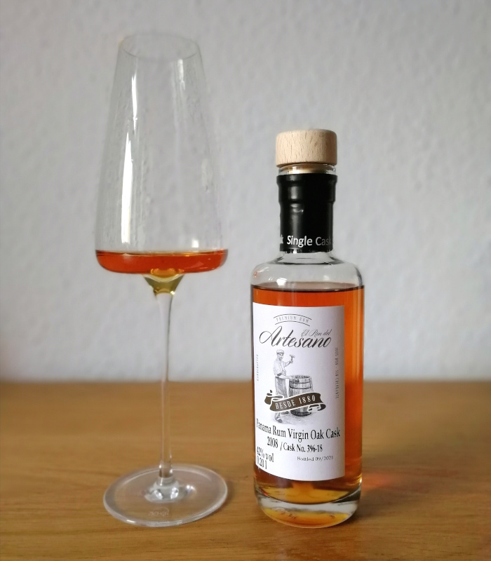 Nun zum Dritten im Bunde, dem El Ron del Artesano Panama Rum Virgin Oak Cask 2008. Man sieht den Unterschied im Namen zu den beiden Vorbesprochenen – hier haben wir eine Jahrgangsabfüllung, destilliert 2008, auf Flaschen gezogen im September 2021, das bedeutet ein grobes Alter von 12 bis 13 Jahren. Das hier verwendete Eichenfass war ein nagelneues, ohne Vorbelegung. Terracottafarben, glitzernd und ordentlich schwer macht der Rum im Glas echt was her, schöne Beine betonen das.