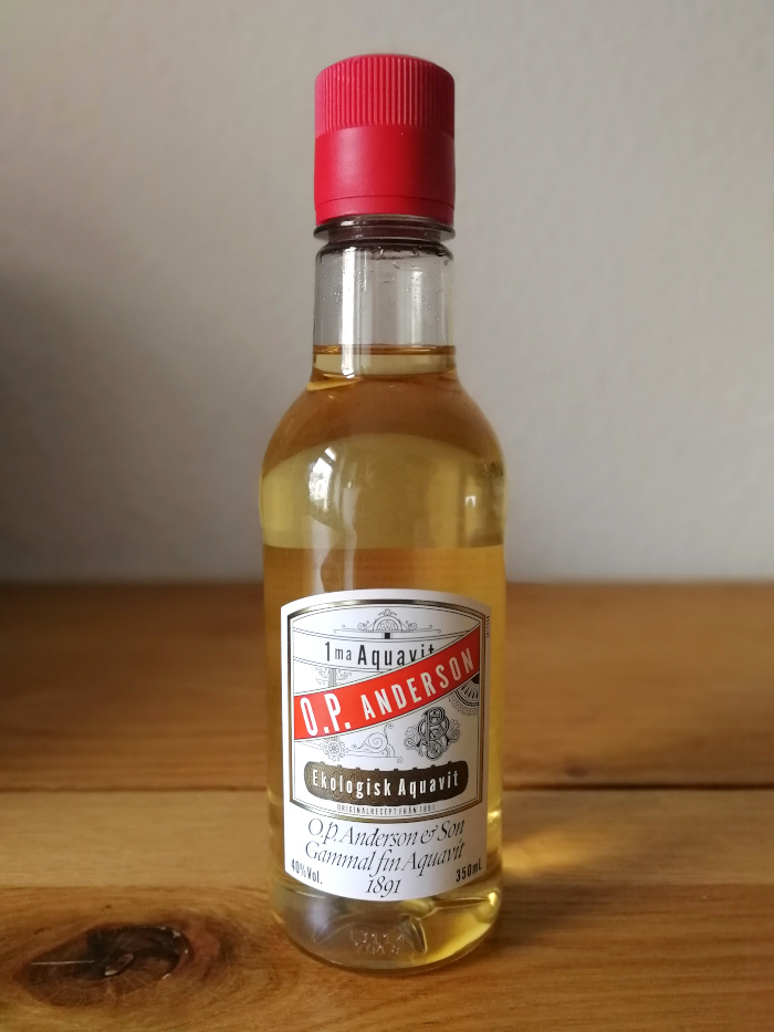 Immerhin eine ganz klassische Spezialität aus Schweden habe ich gefunden: den O.P. Anderson & Son Gammal fin 1891EkologiskAquavit. Er stammt aus der ältesten noch aktiven Aquavitbrennerei Schwedens, das Wort „gammal“ mag abschrecken, doch es entstammt tatsächlich derselben germanischen Wortgeschichte wie das deutsche Wort „gammelig“, bedeutet aber einfach nur „alt“ auf Schwedisch, so wie der Altstadtbezirk in Stockholm auch (hier dekliniert) „Gamla stan“ heißt. Die Zutaten dieses Aquavits sind darum auch ganz klassisch gehalten: Alkohol, Zucker und Gewürze, es handelt sich hier um Kreuzkümmel, Anis und Fenchel. Letztere sind alle in Bioqualität, ein Biosiegel macht auch den Rest des Flascheninhalts zertifiziert. 6 Monate reift der O.P. Anderson, dann kommt er mit 40% Alkoholgehalt in die Flasche, hier eine aus Plastik.