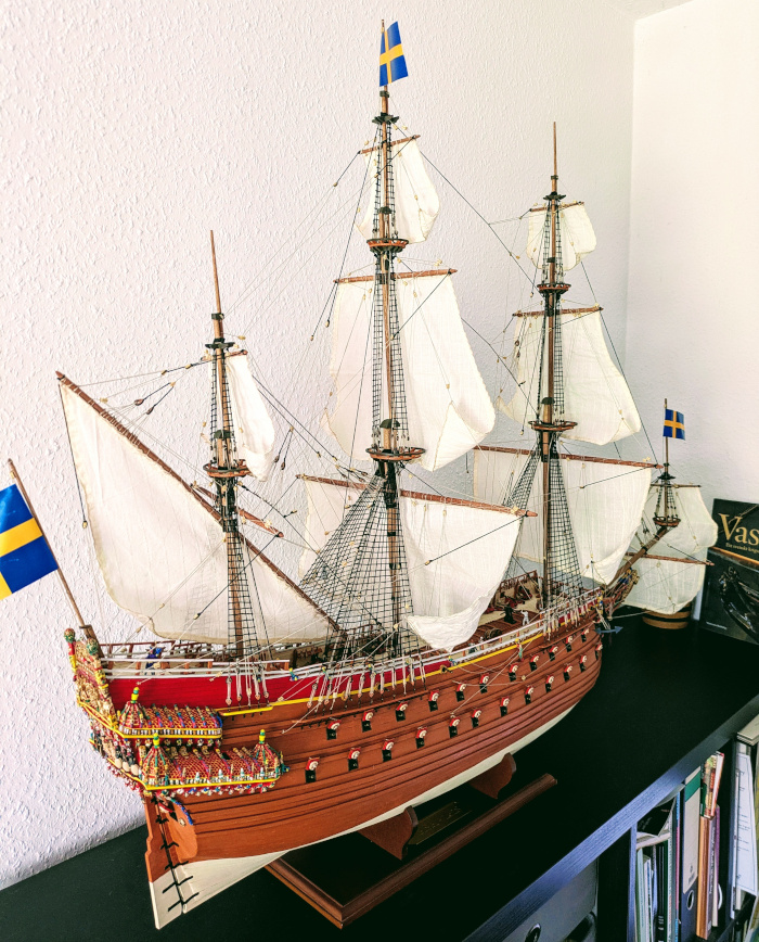 Man braucht Geduld und ein gewisses handwerkliches Geschick, sollte keine Schwierigkeiten mit hartem Anpacken haben, so ein Holzmodell baut sich deutlich anders als ein Plastikmodell, da bekommt man Schwielen an die Finger, und bei manchen Handgriffen, wie der Beplankung oder der Takelung, zweifelt man hin und wieder daran, ob sich diese verteufelte Tätigkeit überhaupt lohnt. Am Ende sage ich: ja, das lohnt sich. Und nun stoße ich mit einem O.P. Anderson Ekologisk Aquavit auf die Vasa an, mehr als nur ein Glas, und freue mich auf meinen nächsten Schwedenbesuch.