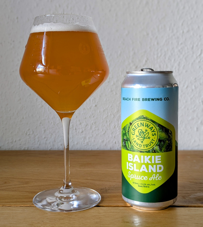 Strandfeuer gehören, so wurde uns erzählt, zum Lebensstil in Campbell River auf Vancouver Island. Tatsächlich kann man, wenn man am Strand der Stadt entlang läuft, immer wieder Reste von Lagerfeuern sehen, teilweise werden da einfach große Stämme in der Mitte angezündet, so kann man natürlich auch Feuer machen. Diese Freizeitbeschäftigung gab der Brauerei Beach Fire Brewing ihren Namen, und ihre Biere sind alle mit viel Regionalität und Lokalkolorit ausgestattet. Am deutlichsten zeigt sich das beim Baikie Island Spruce Ale, von dem ich mir eine Dose nach Deutschland mitgebracht habe. Erstmal die nackten Zahlen: 5,2% Alkoholgehalt, 25 IBU; Pale-, Vienna– und Weizenmalz, die Hopfensorte Warrior und der Hefestamm WHC LAX werden verwendet, und nun die Besonderheit: in Zusammenarbeit mit dem Greenways Land Trust werden auf Baikie Island, die im Flussdelta des Campbell River liegt, Fichtenspitzen von Hand gesammelt, und diese im Brauprozess des Spruce Ales mitbenutzt. Die Insel wurde jahrzehntelang industriell genutzt und soll nun in den Naturzustand zurückversetzt werden; mit jeder gekauften Dose unterstützt man dieses Vorhaben. Fichtensprossen im Bier? Das klingt doch spannend.
