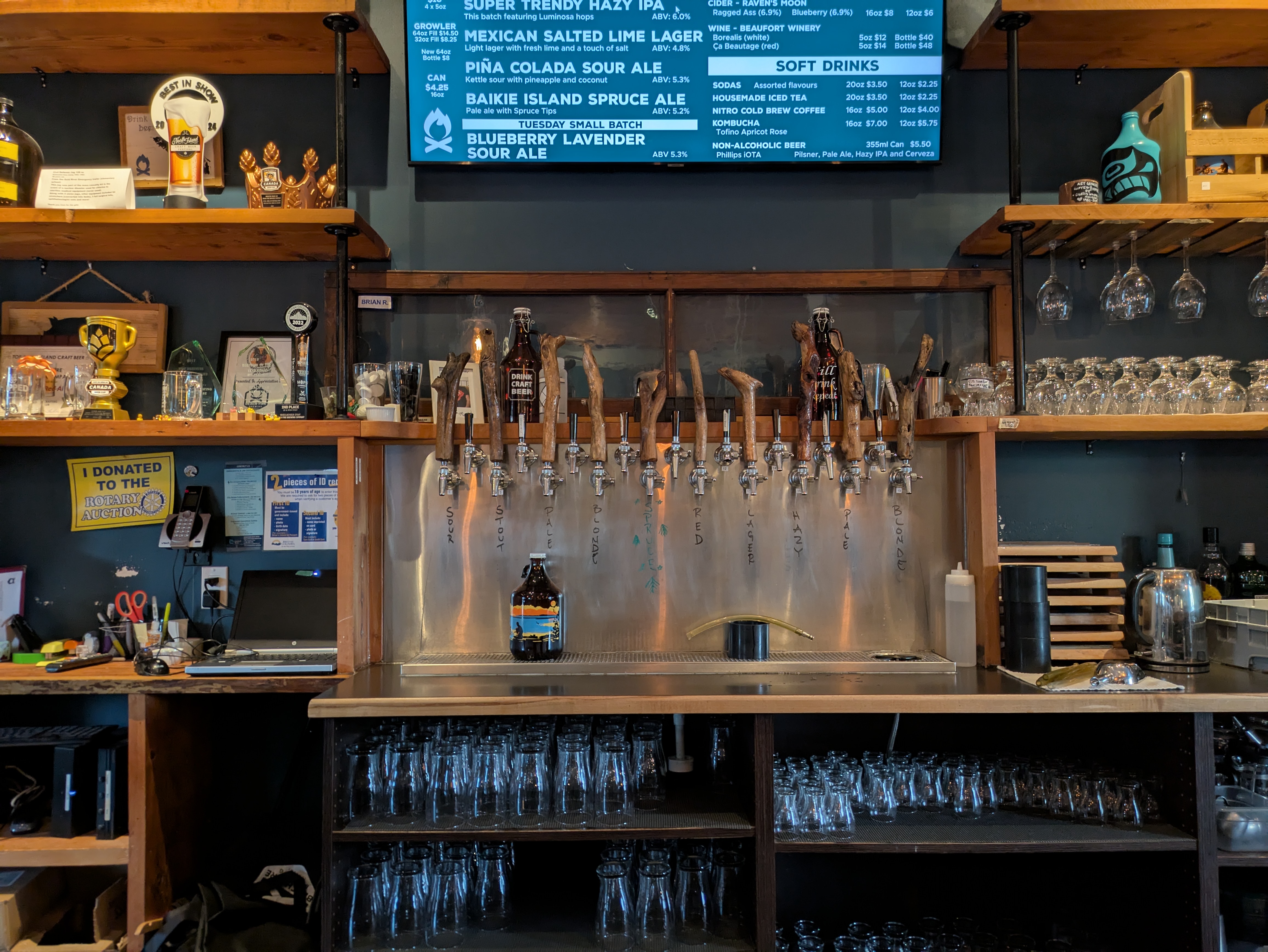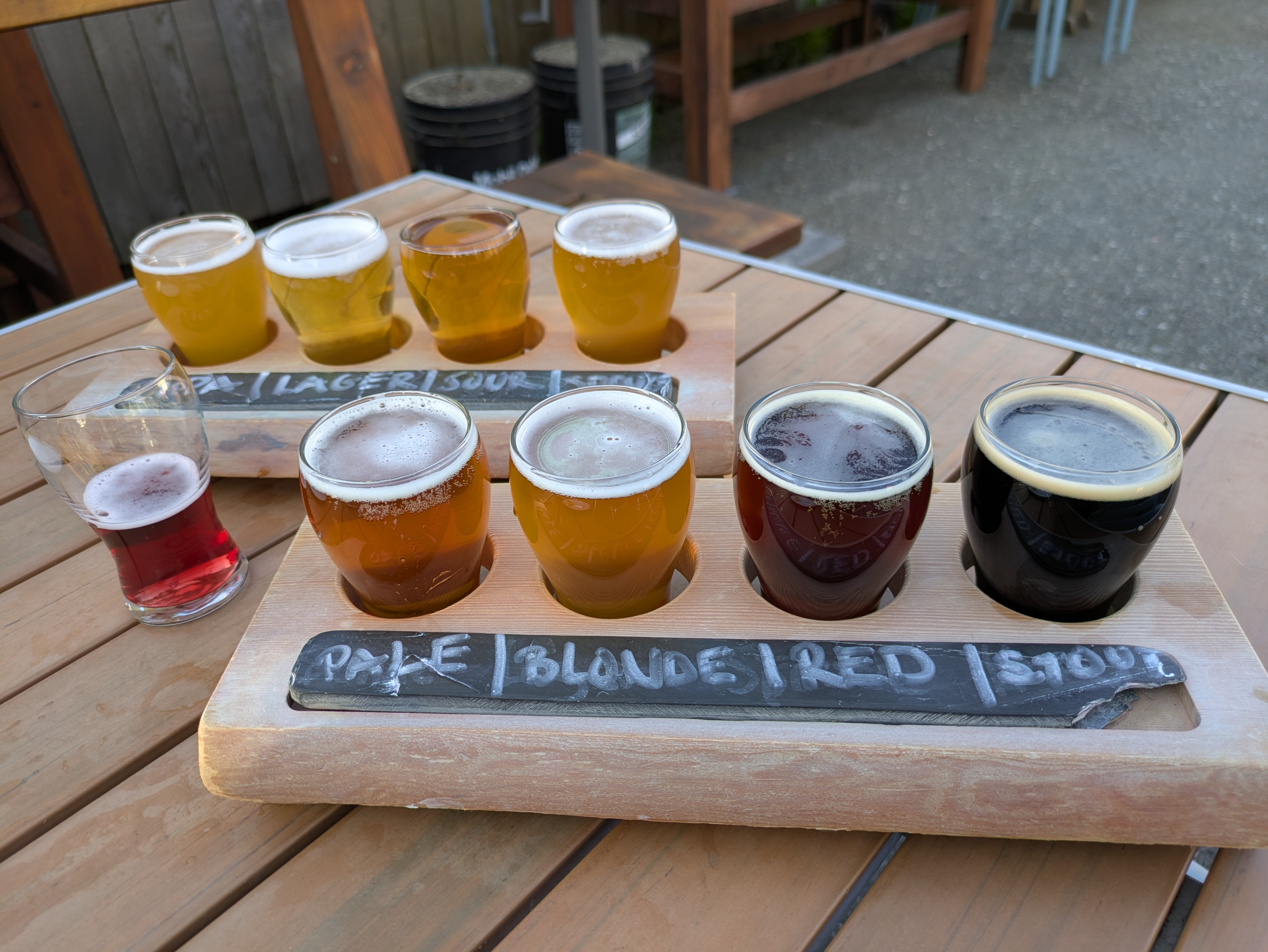 Wie man sieht, kann man dort ein Brett mit mehreren Sorten erwerben, in kleinen Mengen, zum Probieren; ich habe einfach zwei davon bestellt und damit alle Sorten, die die Brauerei aktuell am Hahn hatte, verkostet. Dazu kommen noch ein paar Eindrücke von Campbell River selbst, eine nette, mittelgroße Hafenstadt, ideal als Zentrum für Ausflüge auf Vancouver Island. Es lohnt sich, hinzufahren!