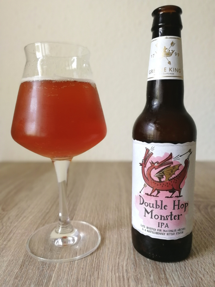 Von der englischen Ostküste stammt das Greene King Double Hop Monster IPA, das es neulich in meinen Bierkelch geschafft hat. Auch wenn der Stil des IPA natürlich aus England stammt, finde ich doch eher selten Brauprodukte von dort in den Märkten meines Vertrauens, um so mehr springt einen dann so ein Bier an, wenn man es mal sieht – was durchaus auch an dem witzig gestalteten Etikett mit dem doppelköpfigen Drachen liegt. Cascade, Chinook, Columbus, Styrian Golding, Willamette (den kannte ich tatsächlich bisher noch gar nicht), das sind die Hopfensorten, da hat man wirklich nicht gegeizt, und auch der Alkoholgehalt von 7,2% passt zum Stil.
