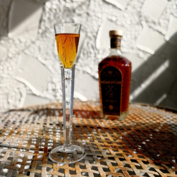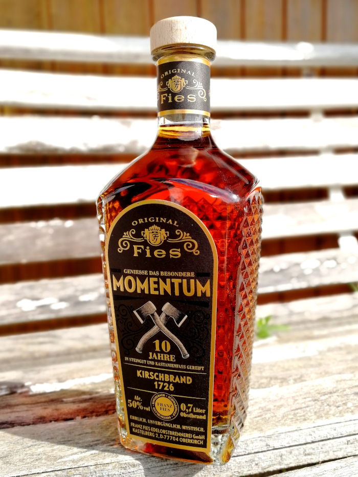 Zum Jubiläum habe ich mir aus diesem großen Backlog einen Brand ausgesucht, der ebenfalls 10 Jahre auf dem Buckel hat. Der Fies Momentum Kirschbrand 1726 10 Jahre war einer der inzwischen selten gewordenen Spontankäufe in einem Getränkemarkt, 2023 war das, denke ich. Natürlich hat erstmal die Präsentation (dazu am Ende mehr) dafür gesorgt, dass man zugreifen will, aber auch die Erläuterung des Inhalts. Im Schwarzwald gebrannt, zehn Jahre erst in Steingut gelagert und dann in Kastanienholzfässern gefinisht, wohl weitere zwei Jahre, die aber seltsamerweise dann nicht in der Altersangabe auftauchen. Ach, diese Details, die mich dann immer quälen, obwohl ich doch lieber einfach den Brand trinken sollte – ich versuche, das in Zukunft ein bisschen entspannter anzugehen. Jetzt aber erstmal den Kirschbrand ins Glas!