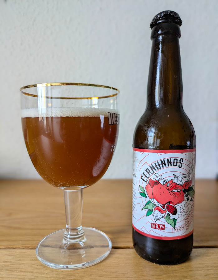 Noch eins von den Bieren, die mir meine liebe Kollegin Meike aus ihrem Normandie-Urlaub mitgebracht hatte: das Cernunnos Bière Blonde Aromatisée Citron Hibiscus aus der dramatisch benannten Brasserie de L’Apocalypse, die in dem nicht weniger beeindruckend benamten Ort Bois-Jérôme-Saint-Ouen in der Normandie liegt. 6,7% Alkoholgehalt, Hibiskus für die Farbe, Zitrone für den Pepp, Zucker für die Süße und vielleicht sogar die Flaschengärung. Ein Bier, das ich aufgrund des Etiketts schon erstmal nicht so recht ernst genommen habe – doch ich wurde überrascht, soviel vorweg.