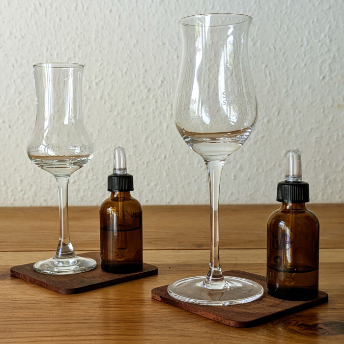 Im Gegensatz zu meinen Spirituosenrezensionen mache ich für die Sirups keine detaillierten Tasting Notes, pur trinkt das eh niemand, darum ist das auch gar nicht interessant. Was macht man sonst damit? Natürlich ist bei mir der Hauptzweck der Einsatz in der Heimmixologie, entsprechend sind auch Rezepte auf der Rückseite der Flaschen angebracht. Für jeden Sirup habe ich aber einen zusätzlichen Cocktail ausgewählt, in dem der Sirup sich besonders präsentieren kann; dazu habe ich darauf geachtet, dass die Basissprituose für jeden Drink eine andere ist, um die Versatilität der Sirupe weiter zu betonen: Whisky, Rum, Cognac, Mezcal und Calvados sollen sozusagen als Leinwand dienen. Nicht immer muss der Sirup die Hauptrolle spielen; manchmal sind es die kleinen, spannenden Aromadetails, die er liefert, die einen Drink so speziell machen. Nun aber genug geredet, rein ins Mixen!