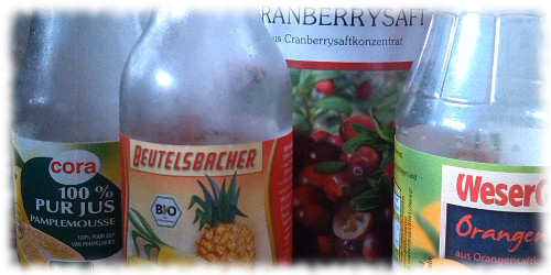 Säfte können ein Problem darstellen, weil sie nur sehr begrenzt haltbar sind, vor allem, wenn die Packung einmal geöffnet wurde. Auch hier, wie beim Wermut, empfehle ich daher möglichst kleine Portionen, idealerweise in durchsichtigen Flaschen, damit man den Zustand (zum Beispiel die dicke, auf dem Saft schwimmende Schimmelschicht) ohne Taschenlampe vor dem Ausgießen erkennt.
